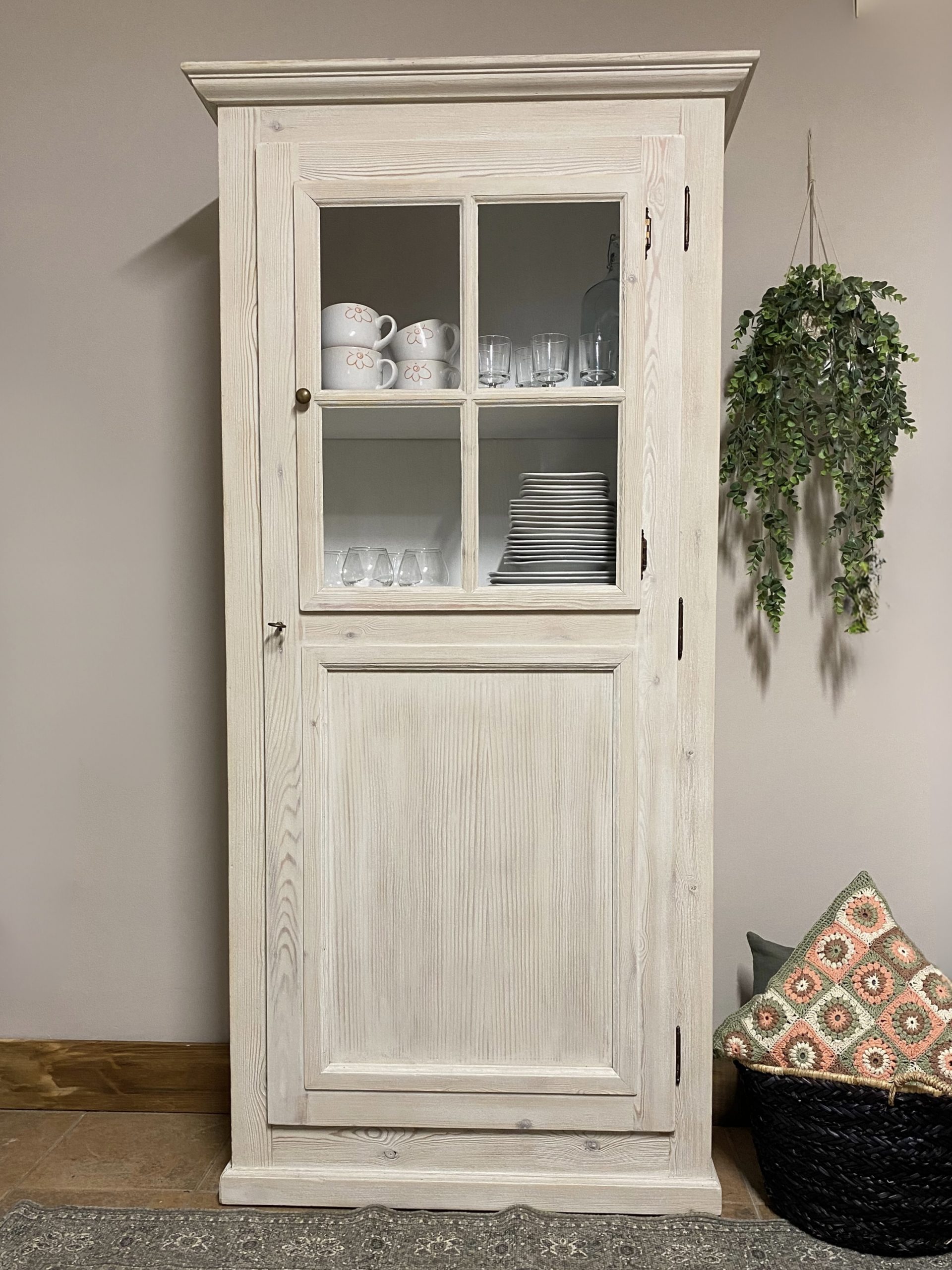 Esta alacena de madera es una verdadera obra de arte que encajará perfectamente con tu decoración. Sus puertas de madera antigua están divididas en tres paneles, siendo la parte superior de vidrio y la inferior de madera maciza. Esta alacena, tallada a mano, combina elementos del estilo rústico y vintage de una manera única. Acabada con barniz, interior blanco. Baldas ajustables a conveniencia. ¡Y lo mejor de todo! No solo su diseño es impresionante, sino que también ofrece una generosa capacidad de almacenamiento. Sus amplios compartimentos te permiten organizar tus objetos personales, vajilla o cualquier otro artículo que desees exhibir o guardar de manera ordenada. La parte superior de vidrio es ideal para mostrar tus piezas de vajilla fina o colecciones de objetos decorativos, mientras que la parte inferior de madera maciza es perfecta para almacenar artículos más pesados y voluminosos. La belleza de esta alacena va más allá de su aspecto exterior. Cada detalle ha sido cuidadosamente elaborado por artesanos expertos, lo que garantiza su durabilidad y resistencia a lo largo del tiempo. El barniz aplicado no solo realza la belleza de la madera, sino que también la protege de arañazos y daños. Las baldas ajustables te brindan la flexibilidad de adaptar el interior de la alacena según tus necesidades cambiantes. Ya sea que desees exhibir tus libros favoritos, organizar tu cristalería o guardar tus utensilios de cocina, esta alacena te ofrece la versatilidad que necesitas. En resumen, esta alacena de madera es mucho más que un simple mueble de almacenamiento; es una pieza de arte funcional que añadirá elegancia y encanto a tu hogar. Su diseño único, su capacidad de almacenamiento y su calidad artesanal la convierten en una elección excepcional para cualquier espacio de tu casa. ¡No esperes más para agregar este toque de sofisticación a tu decoración!