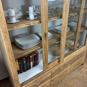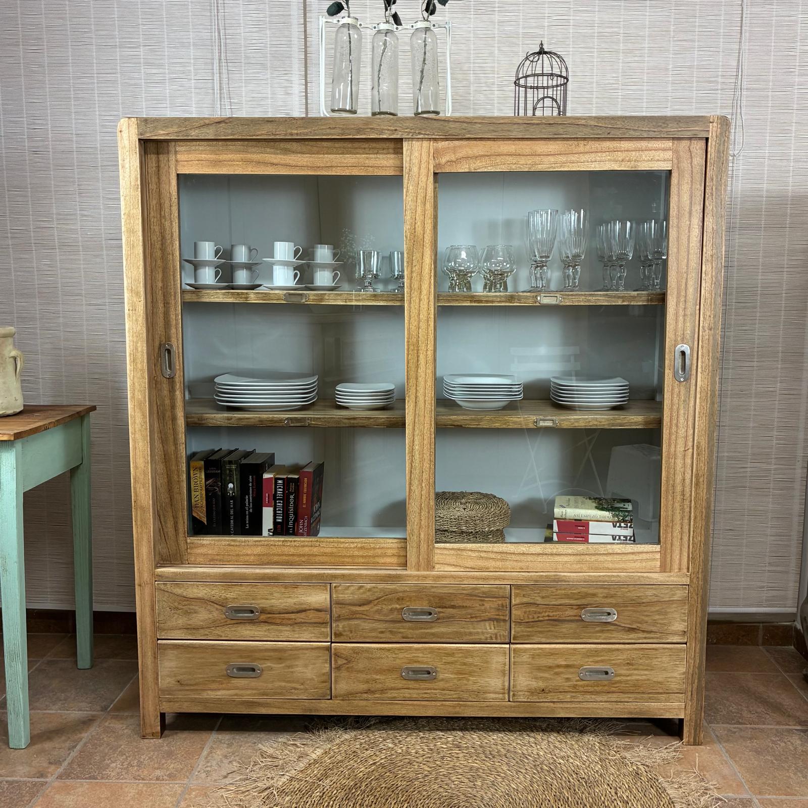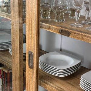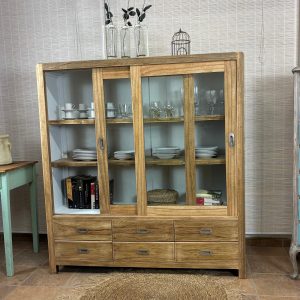 Esta alacena de madera es una verdadera obra de arte que encajará perfectamente con tu decoración. Sus puertas de madera antigua están divididas en tres paneles, siendo la parte superior de vidrio y la inferior de madera maciza. Esta alacena, tallada a mano, combina elementos del estilo rústico y vintage de una manera única. Acabada con barniz, interior blanco. Baldas ajustables a conveniencia. ¡Y lo mejor de todo! No solo su diseño es impresionante, sino que también ofrece una generosa capacidad de almacenamiento. Sus amplios compartimentos te permiten organizar tus objetos personales, vajilla o cualquier otro artículo que desees exhibir o guardar de manera ordenada. La parte superior de vidrio es ideal para mostrar tus piezas de vajilla fina o colecciones de objetos decorativos, mientras que la parte inferior de madera maciza es perfecta para almacenar artículos más pesados y voluminosos. La belleza de esta alacena va más allá de su aspecto exterior. Cada detalle ha sido cuidadosamente elaborado por artesanos expertos, lo que garantiza su durabilidad y resistencia a lo largo del tiempo. El barniz aplicado no solo realza la belleza de la madera, sino que también la protege de arañazos y daños. Las baldas ajustables te brindan la flexibilidad de adaptar el interior de la alacena según tus necesidades cambiantes. Ya sea que desees exhibir tus libros favoritos, organizar tu cristalería o guardar tus utensilios de cocina, esta alacena te ofrece la versatilidad que necesitas. En resumen, esta alacena de madera es mucho más que un simple mueble de almacenamiento; es una pieza de arte funcional que añadirá elegancia y encanto a tu hogar. Su diseño único, su capacidad de almacenamiento y su calidad artesanal la convierten en una elección excepcional para cualquier espacio de tu casa. ¡No esperes más para agregar este toque de sofisticación a tu decoración!