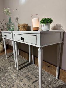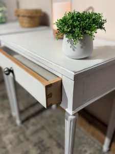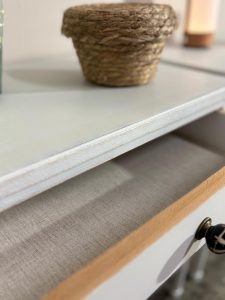 El interior de los cajones ha sido cuidadosamente renovado con un vinilo que imita la textura del lino, ofreciendo un toque sofisticado y práctico a la vez. Este detalle no solo embellece el diseño interior, sino que también asegura un acabado duradero y fácil de mantener.